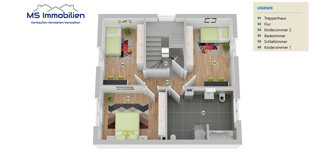 Elternschlafzimmer sowie zwei Kinderzimmer.