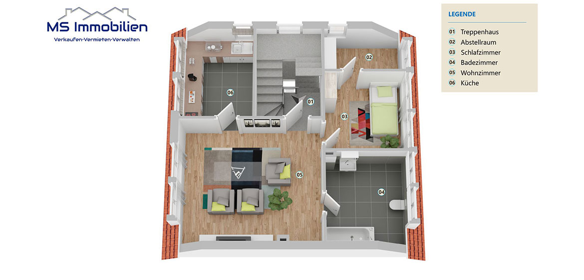 Schlafzimmer sowie eine Küche zur Verfügung, wodurch sich