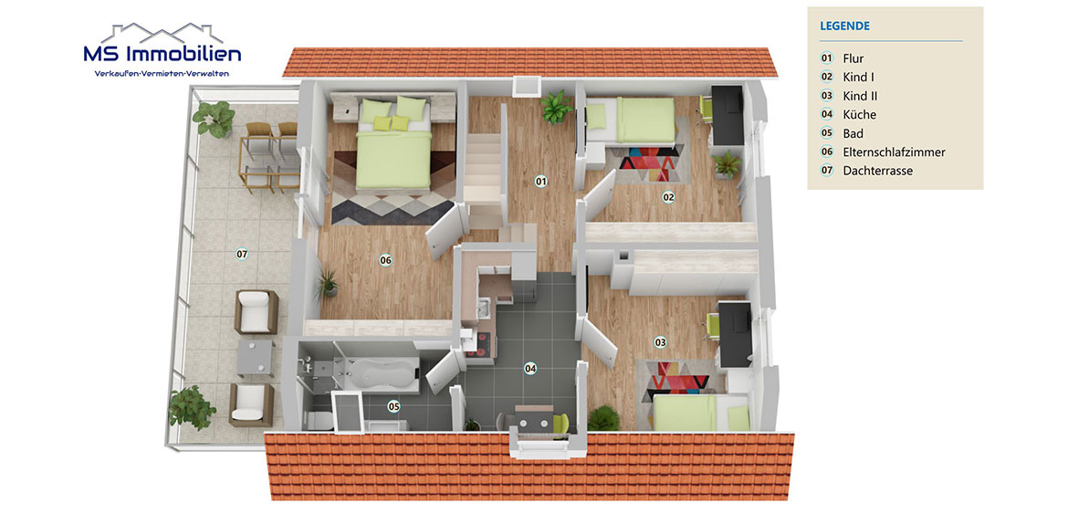 befindet. Wenige Stufen höher folgen zwei Kinderzimmer, eine